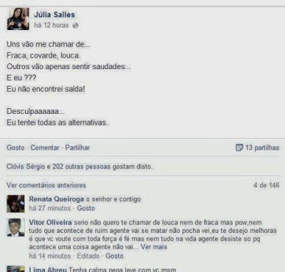 “Quero tranquilizar aos amigos de Júlia. A mesma acordou, já contactua com a equipe médica, já respira espontaneamente logo, logo ela está de volta para seus familiares e colegas do Samu. Um abraço Dr Galileu-hospital Trauma”. O que chamou atenção dos amigos que se mobilizaram nas redes sociais, foi a mensagem que a moça postou no facebook antes de tentar se suicidar. “Uns vão me chamar de… Fraca, covarde, louca. Outros vão apenas sentir saudades… E eu??? Eu não encontrei saída! Desculpaaaaaa… Eu tentei todas as alternativas”, postou Júlia em sua página do face.