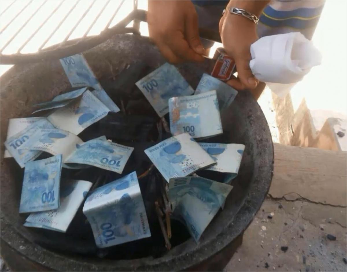 Nas imagens que os policiais tiveram acesso, os criminosos espalharam diversas notas de R$ 100 em uma churrasqueira, junto com carvão. Eles utilizavam o dinheiro para acender o fogo.