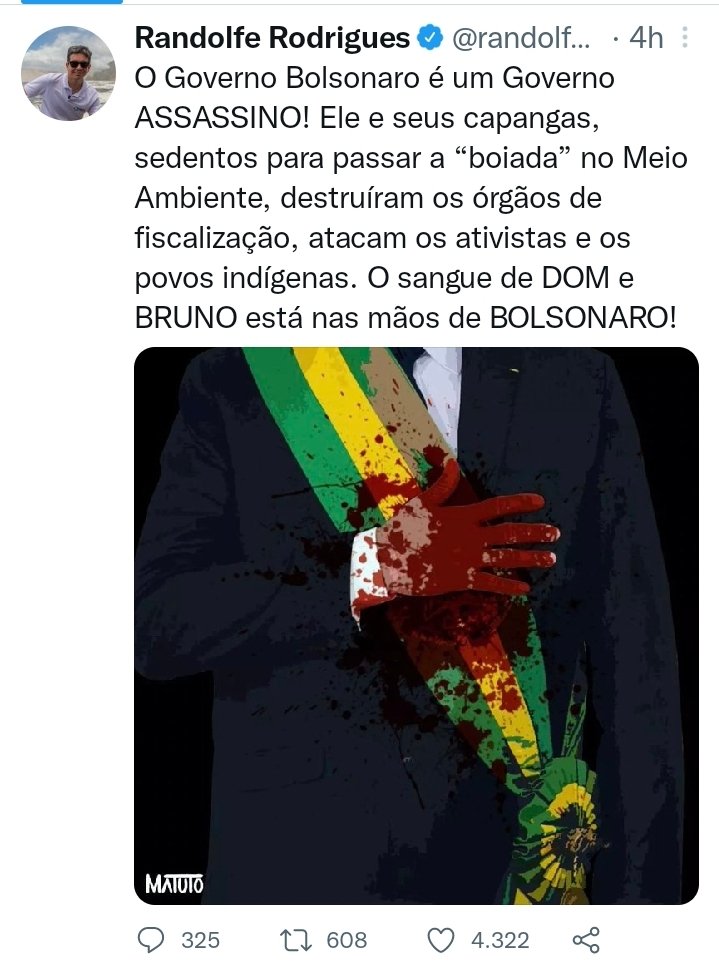 Essa foto postada pelo Senador Randolfe é muito mais do que "mãos sujas de sangue". É uma tremenda incitação à violência contra a vida do presidente Jair Bolsonaro.